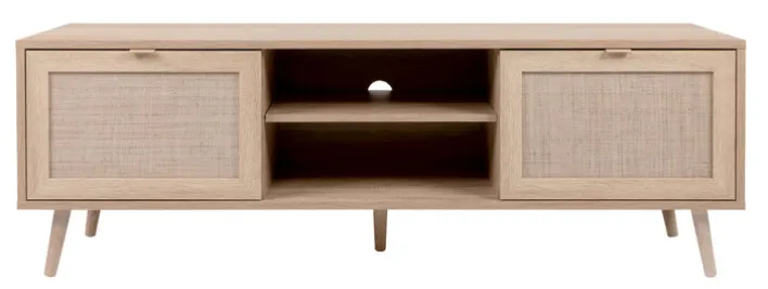 Das 150 x 52 cm große TV-Lowboard BALI in Sonoma Eiche/ Rafia Geflecht ist die ideale Basis für einen großen Fernseher und bietet viel Stauraum für das benötigte Zubehör.