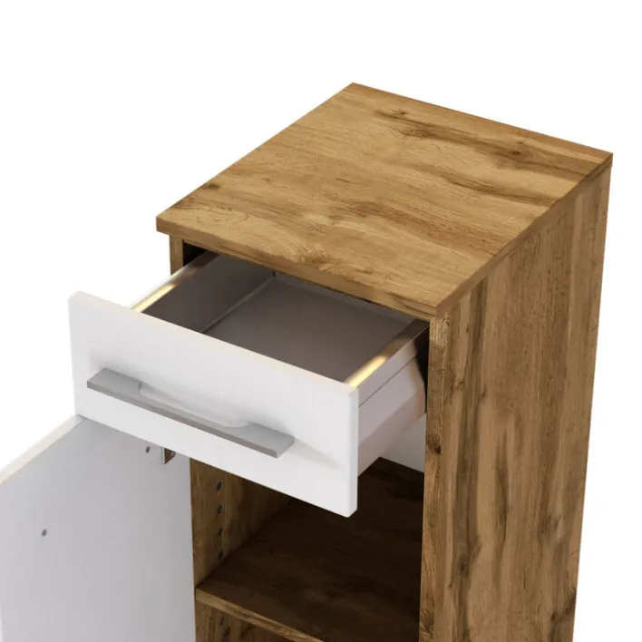 Der Unterschrank LIVORNO besteht aus solider Holznachbildung und vereint einen Korpus in Wotan Eiche mit weißen Fronten. Dank der zusätzlichen Melaminharzbeschichtung sind die Oberflächen strapazierfähig und optimal auf die tägliche Beanspruchung vorbereitet. Die moderne Optik des Unterschranks unterstreichen markante Griffe. Neben dem Design begeistert der Badezimmerschrank mit Stauraum. Hinter einer Drehtür und in einem Schubkasten mit Soft-Close-Funktion bietet er jede Menge Platz für alles, was im Badezimmer benötigt wird.