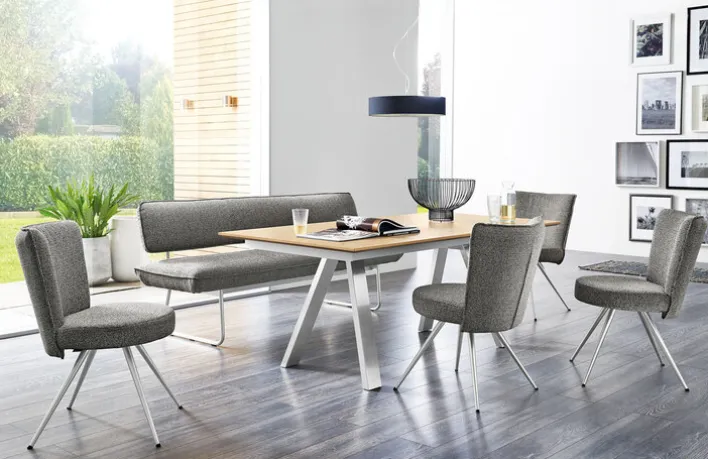 Das stabile Untergestell der Esszimmerbank besteht aus rostfreiem Edelstahl. Die sichtbaren Oberflächen sind poliert. Die durchgehende Sitzfläche und die Rückenlehne sind mit atmungsaktivem Kaltschaum gepolstert und aufwendig mit Textil bezogen. Zum Schutz von empfindlichen Bodenbelägen ist das Kufengestell mit Kunststofffüßen ausgestattet.