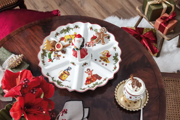 Das Villeroy & Boch Kabarett NOSTALGIE aus der Serie Toys Fantasy ist das stimmungsvolle Herzstück jeder weihnachtlichen Kaffeetafel. Der Deko-Teller mit Weihnachtsmannfigur misst 38 cm im Durchmesser und begeistert mit detailreich gearbeiteten Weihnachtsmotiven.