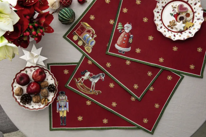 Dieses Set besteht aus vier rechteckigen Tisch- und Platzsets der Serie TOY’S DELIGHT von Villeroy & Boch. Jedes Set zeigt auf rotem Grund ein weihnachtliches Motiv, darunter eine Spielzeugeisenbahn, einen Nussknacker, einen Weihnachtsmann und ein Schaukelpferd. Die Motive sind jeweils in einer Ecke platziert, während goldfarbene Sterne gleichmäßig auf der Oberfläche verteilt sind. Die Umrandung ist grün abgesetzt, was die festliche Gestaltung unterstreicht. Die Maße betragen 48 cm in der Länge, 32 cm in der Breite und 0,2 cm in der Höhe. Das Gewicht eines Sets liegt bei 0,41 kg. Das Material besteht aus Baumwolle und weiteren Textilfasern. Die Sets eignen sich besonders für den Einsatz im Esszimmer und bieten eine stimmungsvolle Grundlage für den festlichen Tisch.