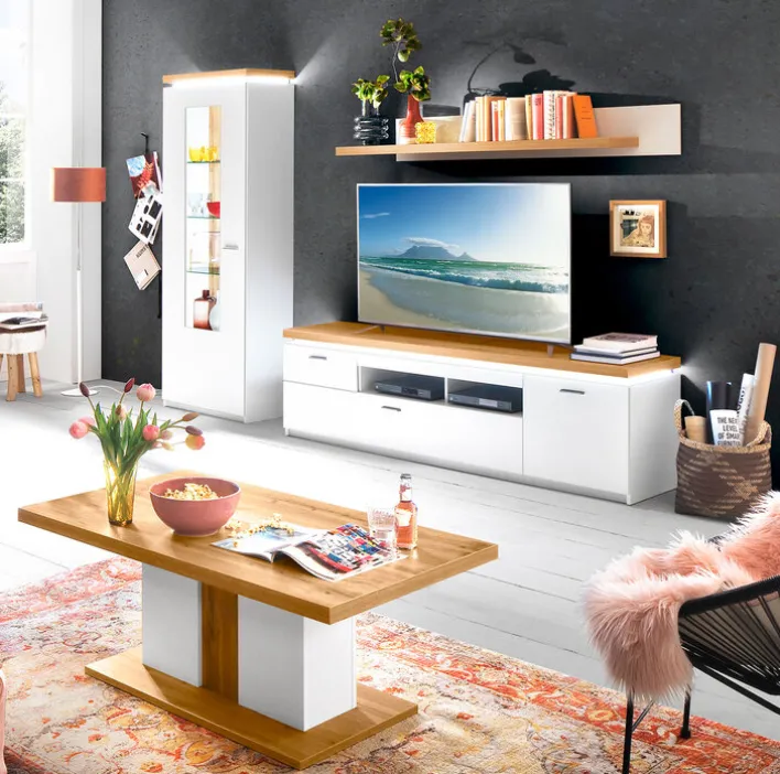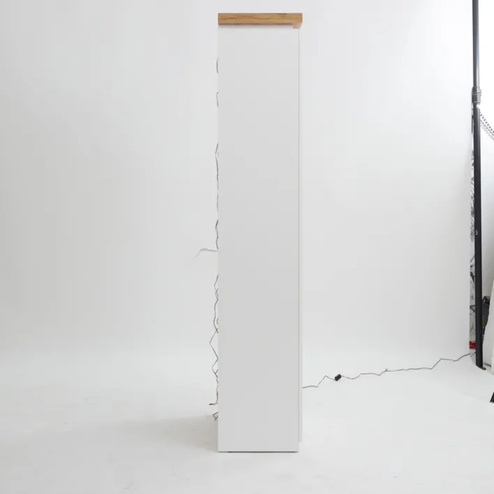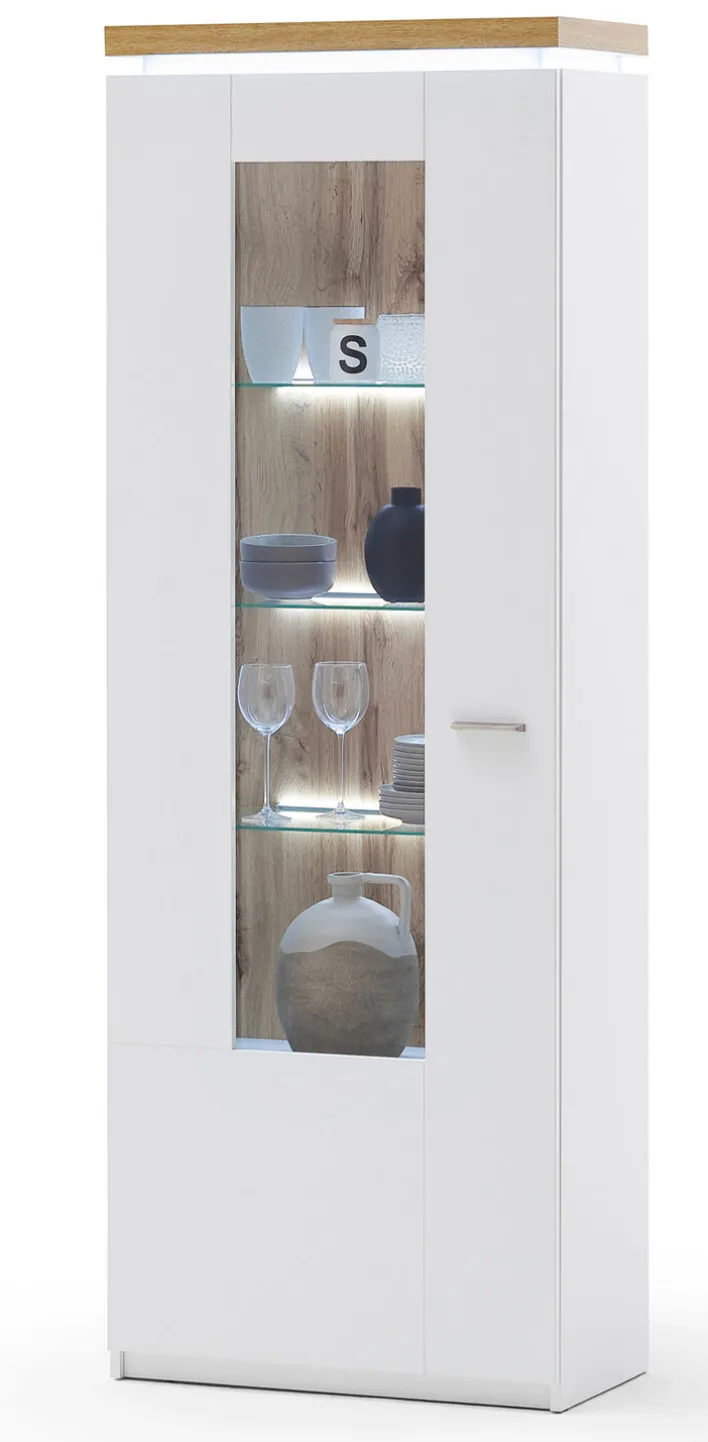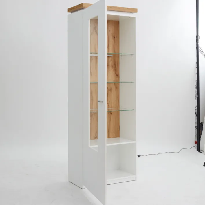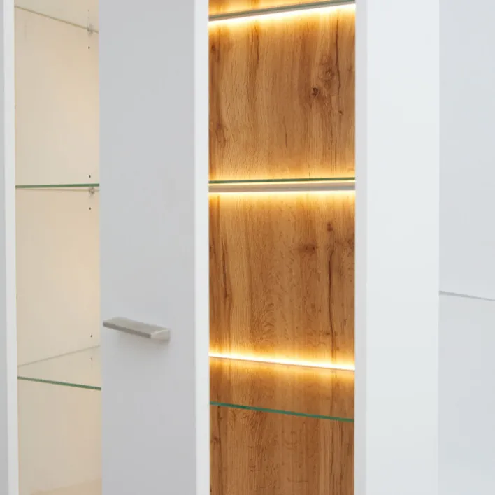 Als Teil der gleichnamigen Wohnzimmer-Serie bringt die Vitrine AARON eine wundervolle Leichtigkeit und Eleganz in die eigenen vier Wände. In strahlend weißem Eichendekor und mit einer integrierten Beleuchtung kann sie durchaus auch als Einzelstück in Flur oder Büro zum Einsatz kommen.