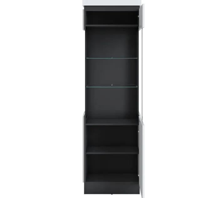 Die moderne Vitrine besticht durch ihr elegantes Design in Alpinweiß und Anthrazit. Mit einer Breite von 60 cm, einer Höhe von 201 cm und einer Tiefe von 40 cm bietet sie ausreichend Platz für Ihre Lieblingsstücke. Die Kombination aus Glas, Holznachbildung und Kunststoff verleiht der Vitrine eine hochwertige Optik und sorgt für Stabilität. Die klare Linienführung und die grifflosen Türen unterstreichen den modernen Stil.