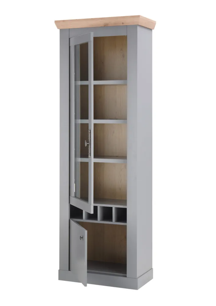 Hinter zwei Drehtüren verbirgt sich der Stauraum. Im oberen Bereich können Gegenstände aus dem Alltag wie Dekorationsartikel anschaulich präsentiert werden. Der untere Bereich hat keinen Glaseinsatz und eignet sich daher für Utensilien, die nicht sichtbar sein sollen. Die Vitrine CHAMBORD ist auch mit vier kleineren offenen Fächern sowie drei Einlegeböden ausgestattet. Das Design des modernen Möbelstücks ist geprägt durch die graue Hauptfarbe im Farbton Light Gray-Dekor sowie den Farbton Artisan Oak-Dekor.