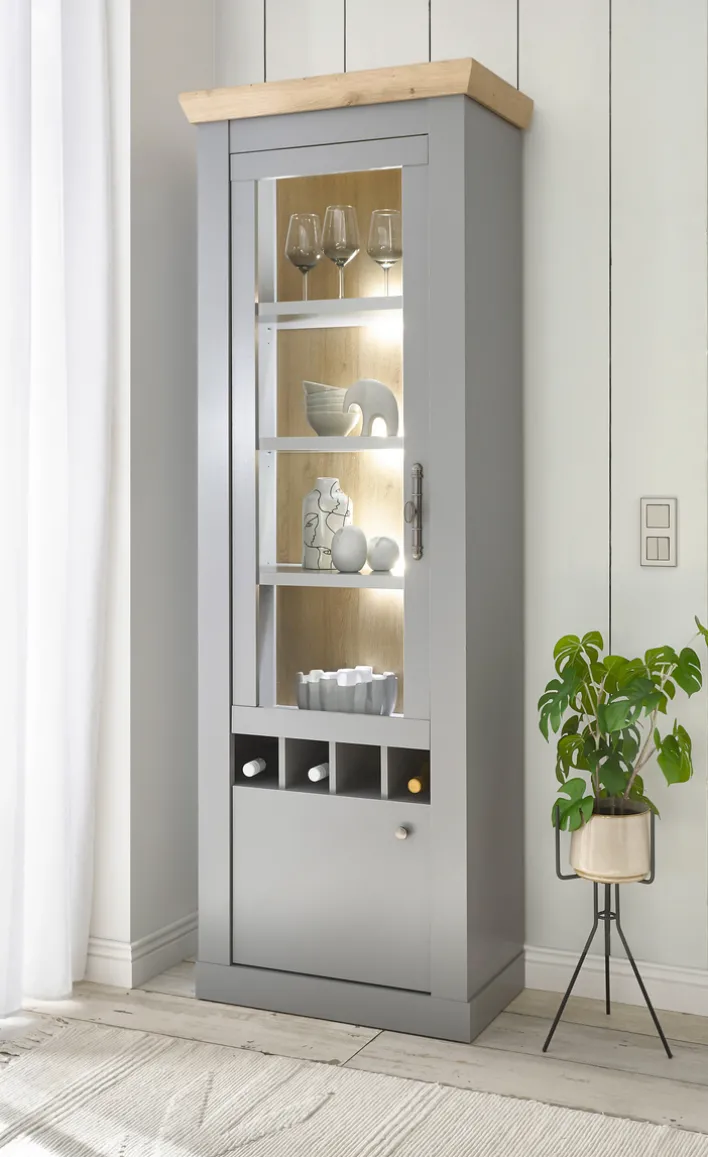 Die hellgrau-braune Vitrine CHAMBORD hat eine Größe von 71 x 201 cm. Sie ist mit einer exklusiven Beleuchtung ausgestattet und zeichnet sich zudem durch die Tür mit Glaseinsatz aus.