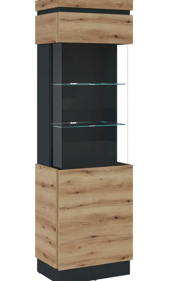 Die Vitrine CORTE AL ist 60 cm breit, 40 cm tief und hat eine Höhe von 201 cm. Der Türanschlag der Drehtür befindet sich auf der linken Seite.