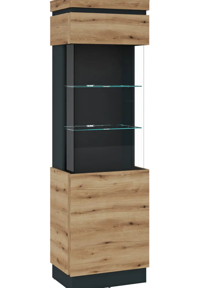 Gefertigt aus Klarglas und brauner sowie grauer Holznachbildung stellt die Vitrine CORTE AR eines der Highlights der Möbelserie dar. Die Kombination aus heller und dunkler Holzoptik wirkt zeitlos und modern. Das integrierte Glas-Element verleiht dem 201 cm hohen Möbelstück Leichtigkeit und Eleganz. Die Tür mit Soft-Close Automatik verstärkt den hochwertigen Charakter der Serie.