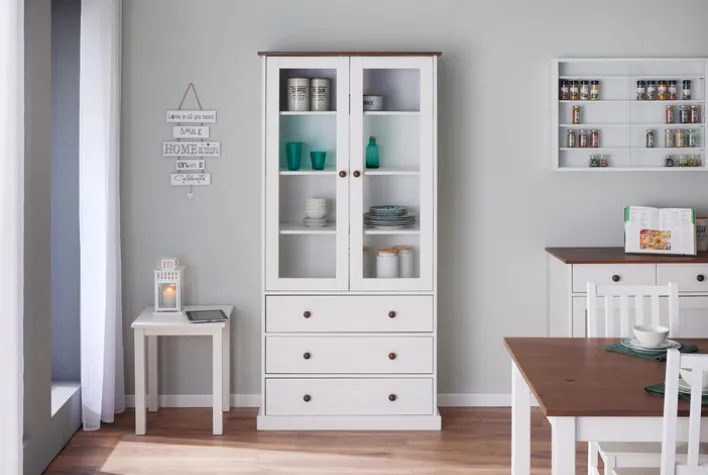 Die weiße Vitrine JACOB aus Massivholz ist ein toller Blickfang in Flur, Esszimmer oder Küche. Gleichzeitig bietet sie erstaunlich viel Stauraum.