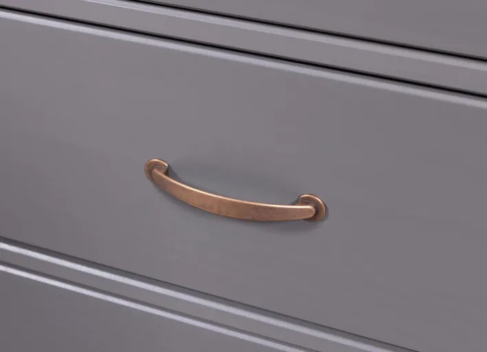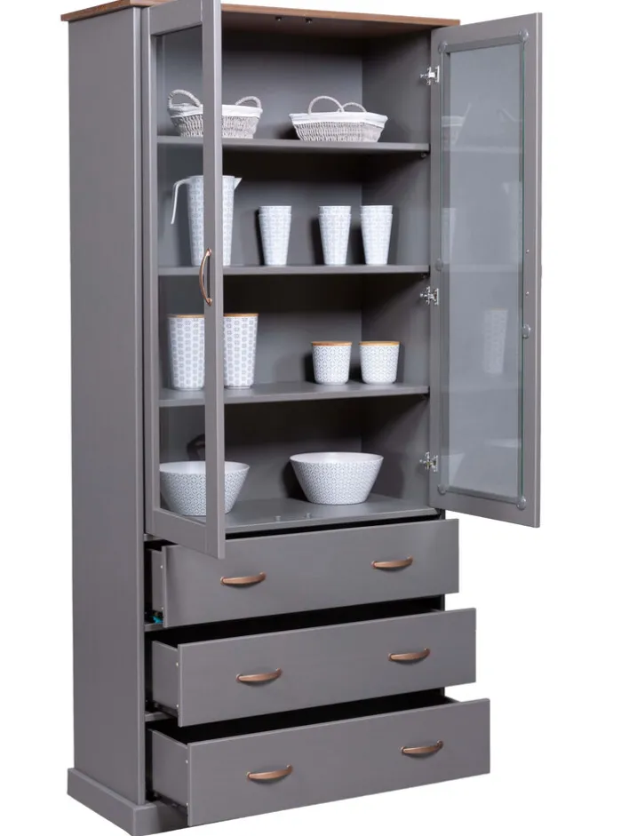 Die Vitrine NICLAS kombiniert das moderne Grau mit kupferfarbigen Griffen und einer in Kupferfarbe abgesetzten Deckplatte. Mit dieser attraktiven Farbkombination zieht das Möbelstück alle Blicke auf sich. Ein Highlight ist die Vitrine allerdings nicht nur optisch! Hinter ihren Glastüren bietet sie auf vier Ebenen ausreichend Platz für das schönste Porzellan und elegante Gläser. In den drei breiten Schubkästen bietet der Vitrinenschrank weiteren Stauraum für Servietten, Besteck und vieles mehr.