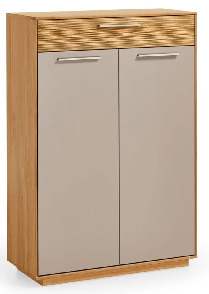 Der Korpus präsentiert sich bei der Schuhkommode LOVENO von VOSS in Eiche Bianco in teilmassiver Ausführung. Die Schublade im oberen Bereich setzt sich ebenfalls mit Blende in Eiche Bianco in Szene. Perfekt auf das Erscheinungsbild abgestimmt sind die beiden im Farbton Taupe lackierten Türen. Mit Ihnen wird ein Raum verschlossen, der mit vier belastbaren Einlegeböden ausgestattet ist. Die obere Ablage steht für dekorative Kreativität zur Verfügung und nimmt kleinere Gegenstände auf.
