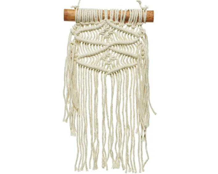 Die schöne Makramee-Arbeit der Wanddeko ist aus reiner Baumwolle gefertigt. Die Naturfasern sind gefärbt. Der Naturholzstab der schönen Deko ist unbehandelt. Die Wanddeko ist mit einem Aufhänger ausgestattet und für den Innenbereich geeignet.