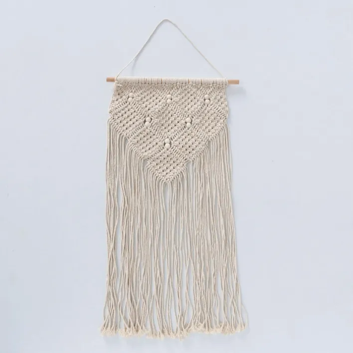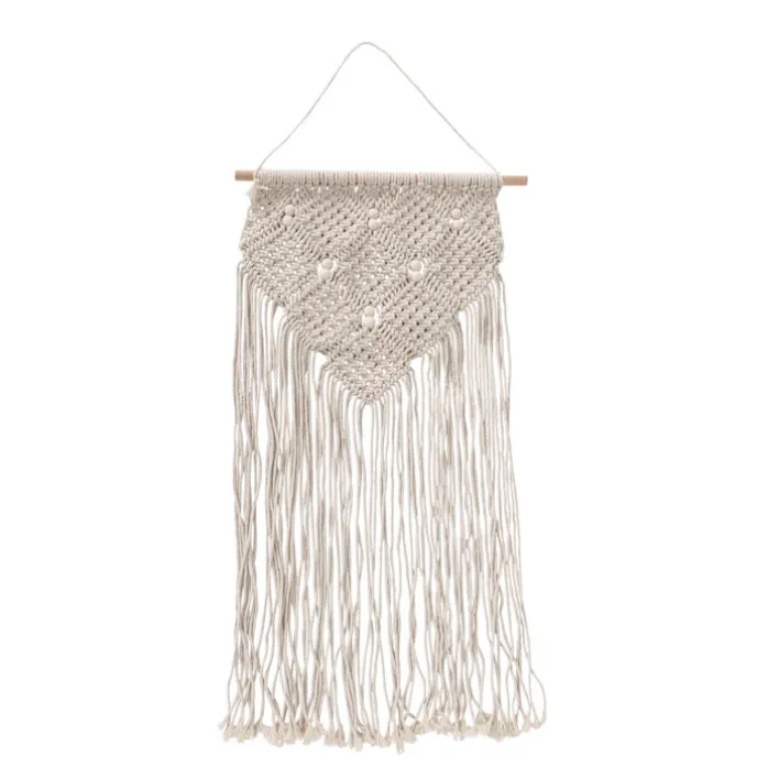 Die Wanddeko MAKRAMEE wird inklusive Aufhänger geliefert. Seine Höhe liegt bei 80 cm, die Breite beträgt 43 cm. Die Deko besteht aus Polyester und Buchenholz.