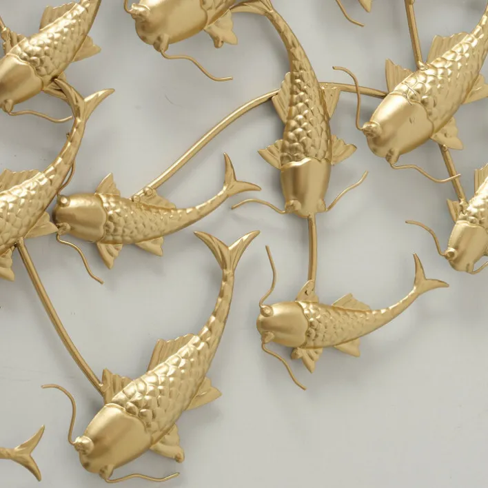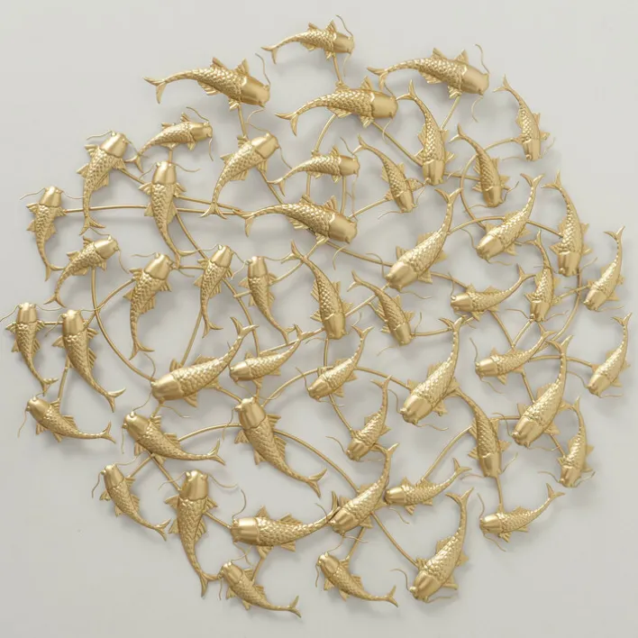 Zu einer Bereicherung für jedes Heim wird das dekorative Wandobjekt MAZU FISCH. Es setzt einen tollen maritimen Akzent, wirkt durch den goldenen Farbton zugleich magisch schillernd. Das Objekt, das zahlreiche miteinander verbundene Fische zeigt, besteht aus pulverbeschichtetem Metall und beeindruckt mit seinem Durchmesser von 82 cm.