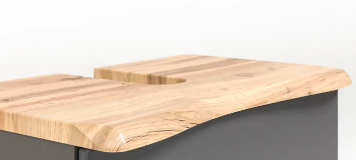 Der Waschbeckenunterschrank BRÜGGE benötigt eine Stellfläche von 61 x 55 x 40 cm und besteht aus solider Holznachbildung. Seinen Korpus in Graphitgrau kombiniert er mit mattgrauen Fronten. Die Baumkantenplatte und die Blende in Holzfarbe verleihen dem Unterschrank einen rustikalen Twist und machen ihn zum Eyecatcher. Doch nicht nur optisch überzeugt das Möbelstück. In einem geräumigen Schubkasten mit Soft-Close bietet er ausreichend Platz. Die Oberplatte ist mit einem Siphonausschnitt versehen, der die Installation des Waschbeckens erleichtert.