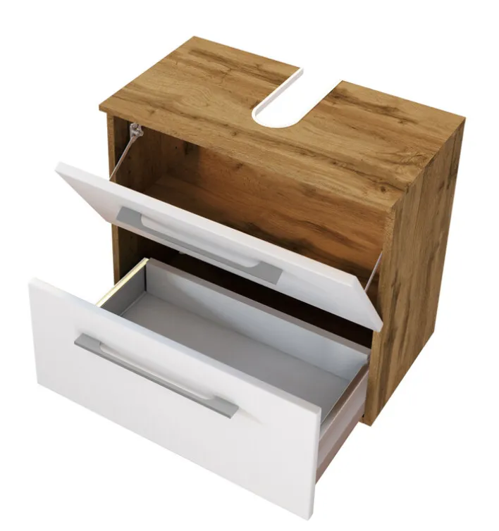 Der Waschbeckenunterschrank LIVORNO in den Maßen 60 x 53 cm ist ein praktischer Helfer in jedem Badezimmer oder wo auch sonst im Haushalt sich ein Waschbecken befindet. Dieser besteht aus einem Gehäuse im Deko-Stil Wotan Eiche, während der eingefügte Schubkasten sowie die Klappe in Weiß matt gehalten sind.