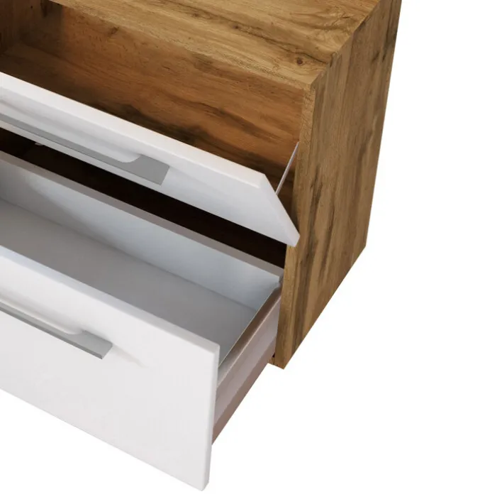 Aus dem Hause LIVORNO holt man sich mit diesem Waschbeckenunterschrank durch die wohnliche Farbkombination, die durch die grauen Griffe aus Metall von Klappe und Schubkasten ergänzt wird, viel Behaglichkeit ins Haus. Die Deckplatte verfügt über einen Siphonausschnitt. Die Tiefe der beiden Staufächer beträgt 35 cm, sie besitzen die praktische „Soft Close“-Funktion.