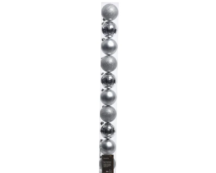 Die silberfarbigen Kugeln aus bruchfestem Kunststoff glänzen sowohl am Weihnachtsbaum als auch an einem Tannenstrauß in der Vase schön. Jede der Weihnachtskugeln aus dem 10-teiligen Set hat einen Durchmesser von sechs Zentimetern. Zudem sind die Kugeln mit Anhängern gestaltet.