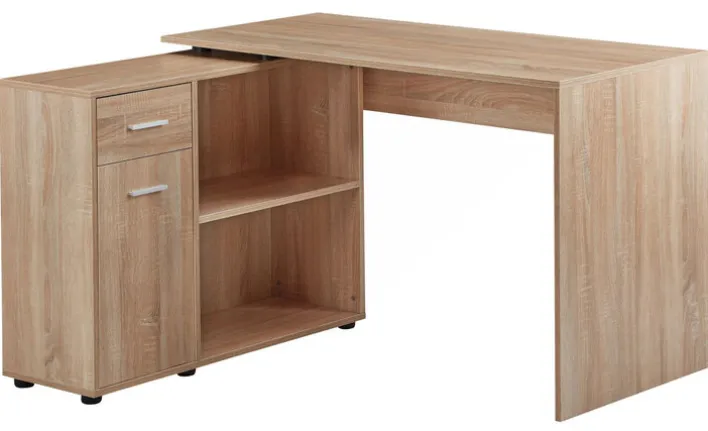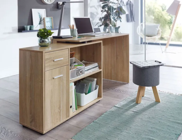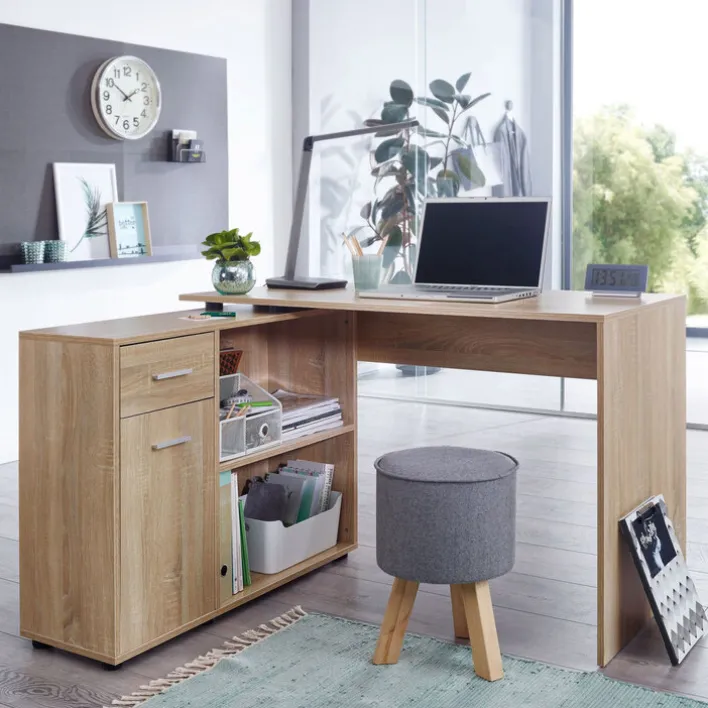 Der Winkelschreibtisch lässt sich den eigenen Bedürfnissen und den Platzverhältnissen anpassen. Er kann gewinkelt oder ausgestreckt stehen. Auf der Schreibtischfläche ist Platz zum Arbeiten, für den Computer und die Schreibtischlampe, während Unterlagen auf der Abstellfläche liegen können. Stauraum ist mit zwei offenen Fächern, einer Schublade und einem Schrankfach mit Drehtür reichlich vorhanden. Hier lassen sich alle Arbeitsutensilien verstauen. Der Schreibtisch hat ein dekoratives Sonoma Eiche Dekor, das mit Melaminharz beschichtet ist.