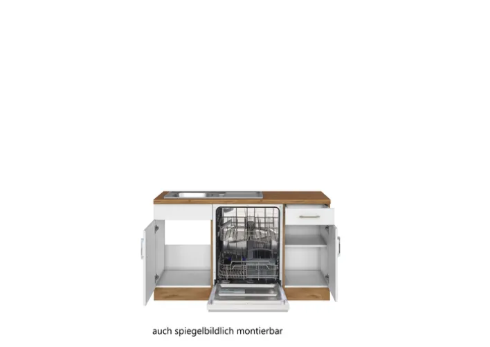 Einfach perfekt! Bei dieser platzsparenden Küchenzeile sind Backofen, Dunstesse und Geschirrspüler bereits integriert. Durch die L-Form ist die ODENSE Kombination ein Traum für alle, die kurze Arbeitswege in der Küche bevorzugen. Auch Wände mit Fenstern lassen sich dank der einzelnen Module bestens nutzen. Die Optik der Winkelzeile überzeugt ebenfalls, liegen doch weiße Küchen mit holzfarbenen Elementen voll im Trend. Die Küchenzeile wird zerlegt geliefert.