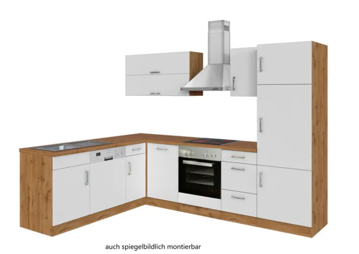 Die Winkelzeile ODENSE kann durch ihre hervorragende Material- und Verarbeitungsqualität mit HPL-beschichteter Arbeitsplatte und Metallgriffen in edler Chromoptik überzeugen. Ihr modernes Design vereint eine attraktive Holznachbildung mit neutral gehaltenen Elementen aus MDF. Außerdem kann sie spiegelbildlich aufgebaut werden. Die Küchenzeile wird in einer Komplettausstattung einschließlich hochwertiger Elektrogeräte von der deutschen Marke PKM geliefert. Mit dabei sind Kühl-/Gefrierkombination, Geschirrspüler, Backofen, Ceran-Kochfeld und Dunstesse.
