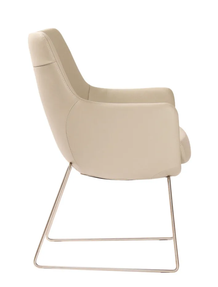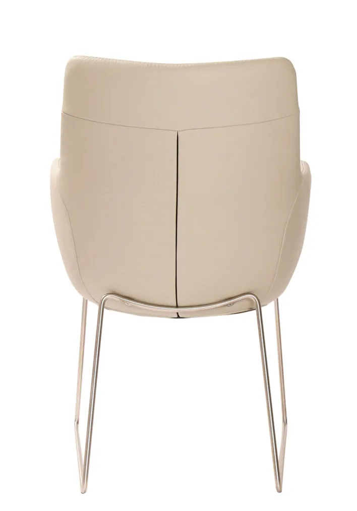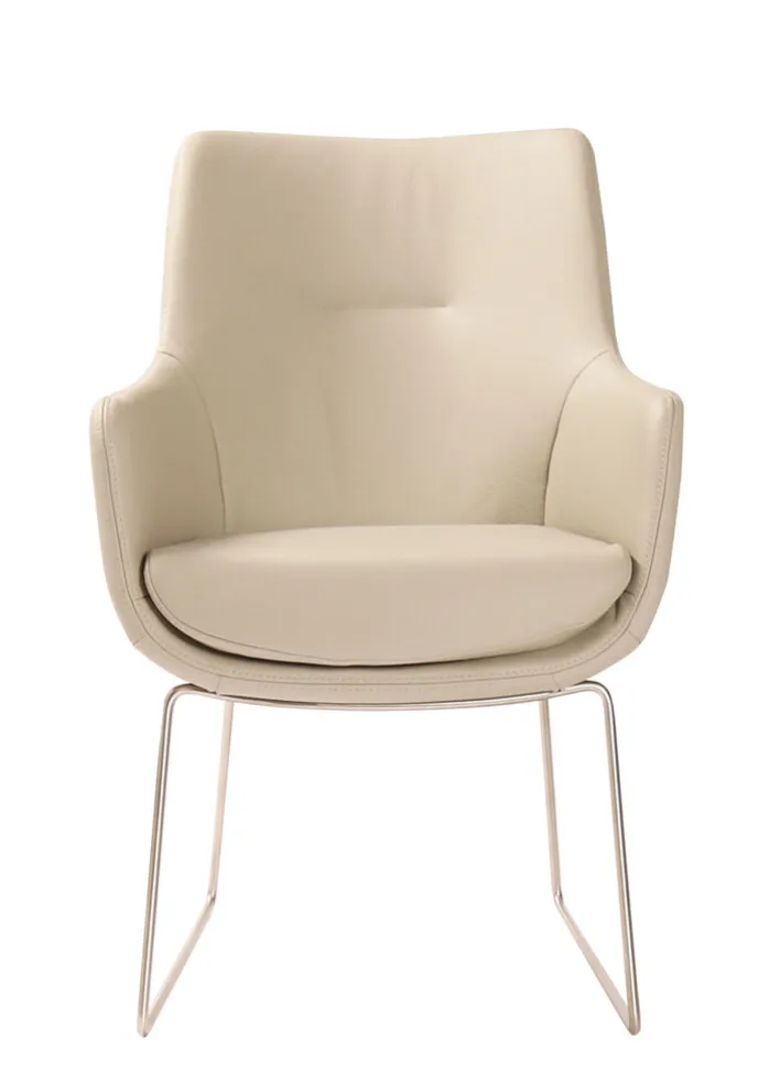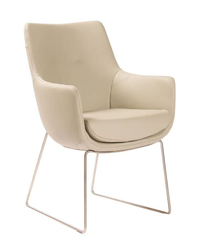 Der WK-WOHNEN Armlehnstuhl mit den Maßen 60 x 89 x 61 cm besteht aus einem silberfarbigen Kufengestell aus Edelstahl und einer Sitzschale mit Polyetherschaumpolsterung. Bezogen mit weißem Leder wirkt der Esszimmerstuhl top modern, lässt sich jedoch auch mit klassischen Möbeln kombinieren. Neben der gepolsterten Sitzfläche sorgen eine bequeme Sitzhöhe von 51 cm und feste Armteile für einen hohen Sitzkomfort. Damit der Boden beim Verrutschen des Armlehnstuhls nicht zerkratzt werden, ist das Kufengestell mit Filzgleitern ausgestattet.