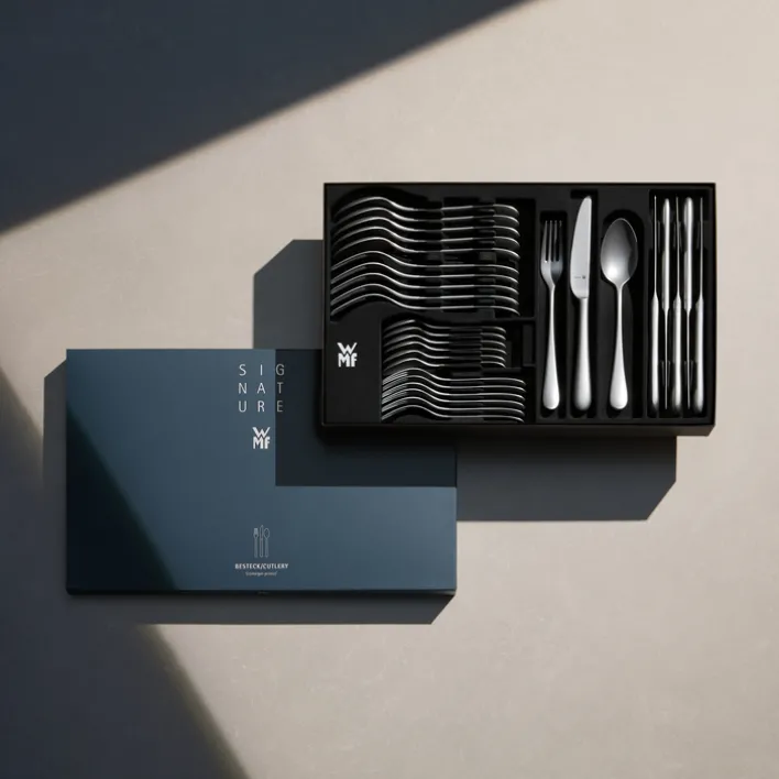 Das Besteckset MERIT der Marke WMF besteht aus 30 Teilen und ist für den Einsatz im Küchenbereich konzipiert. Das Set beinhaltet jeweils sechs Menümesser, Menügabeln, Menülöffel, Kuchengabeln und Löffel. Das Material besteht aus Edelstahl, was für Langlebigkeit und eine pflegeleichte Handhabung sorgt. Die silberfarbige Ausführung verleiht dem Besteckset ein zeitloses und neutrales Erscheinungsbild.