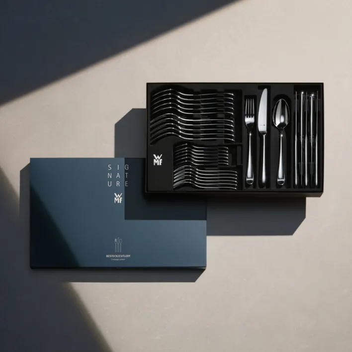 Das Set hat eine Länge von 26,5 cm, eine Breite von 43 cm und eine Höhe von 5,5 cm. Das Gesamtgewicht beträgt 2,19 kg. Die Ausführung als Setartikel umfasst 30 Teile. Die robuste Materialwahl und die polierte Oberfläche unterstützen eine lange Haltbarkeit und pflegeleichte Nutzung im Alltag. Die markante Oberflächenstruktur der Griffe sorgt für sicheren Halt bei der Verwendung.