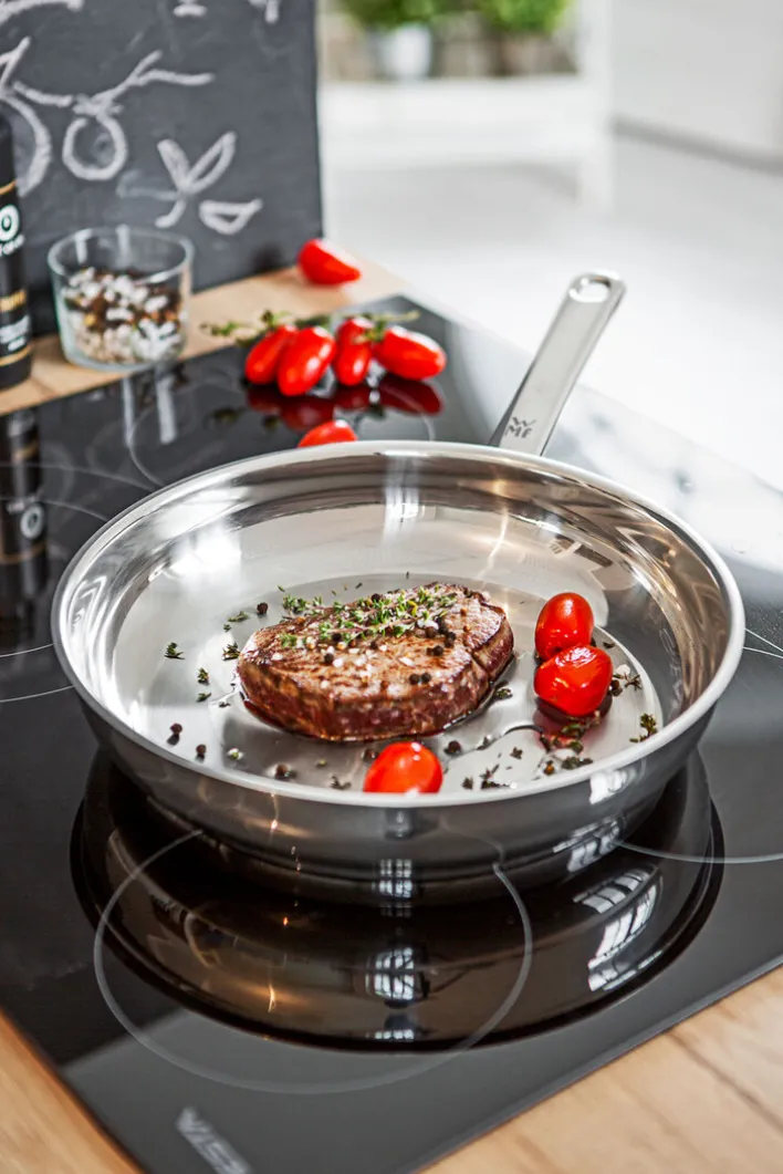 Die silberfarbige WMF Pfanne PROFI aus Edelstahl hat einen Durchmesser von 28 cm und lässt sich vielseitig zum Braten und Schmoren verwenden.