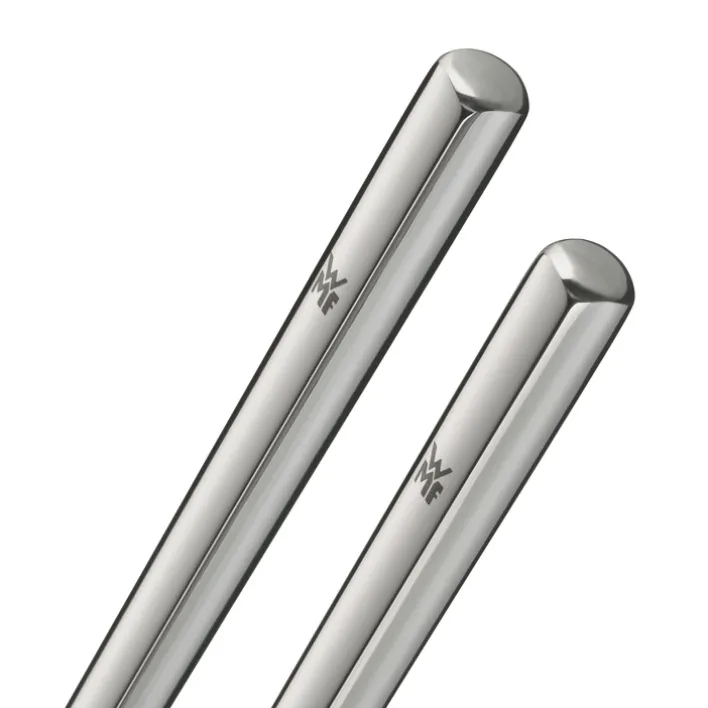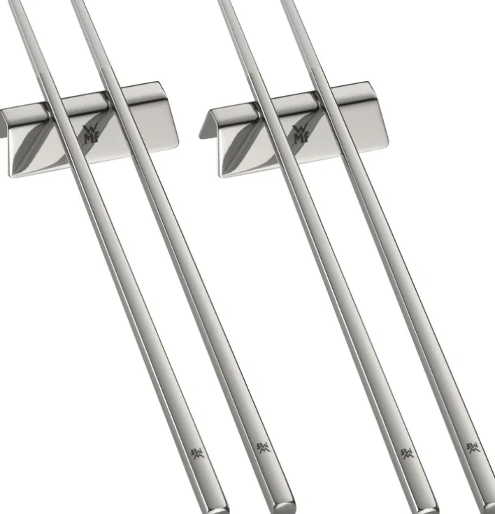 Die Essstäbchen aus dem Set NUOVA liegen durch eckige Kanten am Griffende optimal in der Hand. Die Spitzen sind derweil matt gestaltet, um die Speisen besser aufnehmen zu können. WMF setzt hier seinen rostfreien und spülmaschinenfesten Cromargan-Edelstahl ein. Durch das farbechte, geschmacksneutrale und säurebeständige Material werden die Essstäbchen zum langfristigen Begleiter bei Sushi, Ramen und Co. Ein hochwertiger Stülpdeckel für das vierteilige Set ergänzt die zeitlose Eleganz der Stäbchen.