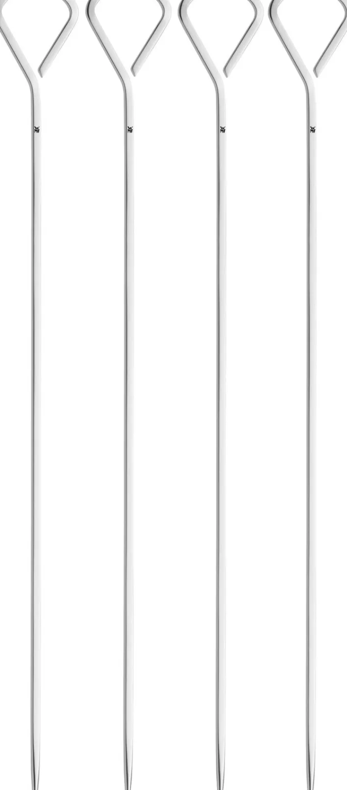 Die WMF Grillspieße BBQ werden als 4er-Set geliefert. Sie messen jeweils 37 cm. Ihr silberfarbiger Edelstahl ist hitzebeständig und rostfrei.