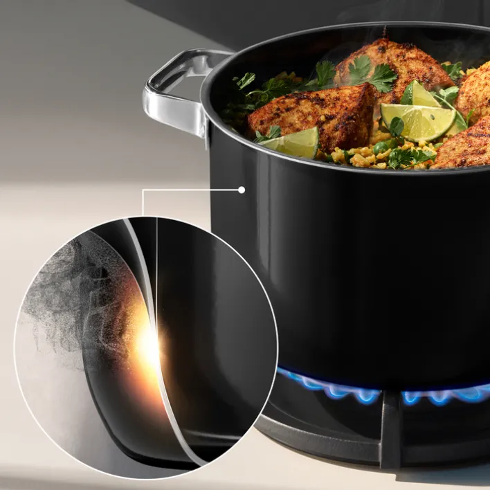 Optisch überzeugt das Set durch seine glänzende, schwarze Oberfläche, die mit silberfarbenen Elementen an Griffen und Deckelrahmen harmoniert. Die klare Linienführung und die glatte Oberfläche verleihen dem Set ein modernes und zeitloses Design. Mit einer Länge von 29,5 cm, einer Breite von 59,5 cm und einer Höhe von 21,5 cm ist das Set kompakt und vielseitig einsetzbar. Das Gesamtgewicht beträgt 6,49 kg. Die Töpfe sind spülmaschinengeeignet und zeichnen sich durch ihre Alltagstauglichkeit in der Küche aus.