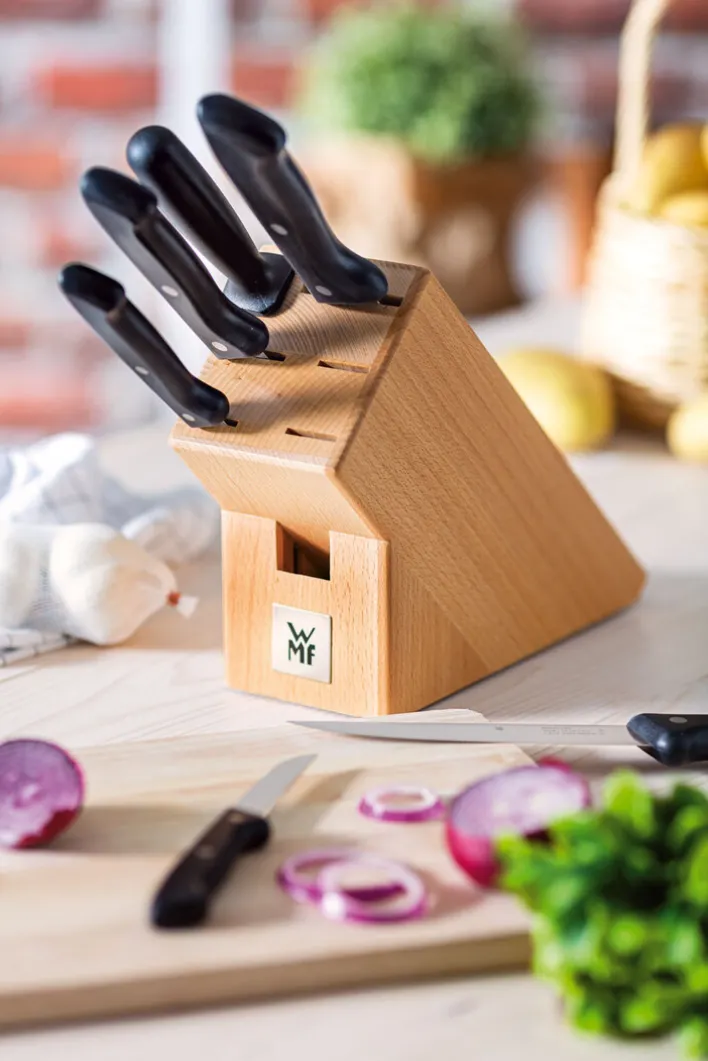 Der 7-teilige Messerblock CLASSIC LINE aus dem Hause WMF ist eine ideale Messerserie für Einsteiger. Mit dieser klassischen Kollektion steht auch jungen Haushaltsgründern für jeden Bedarf das passende Schneidemesser zur Verfügung.