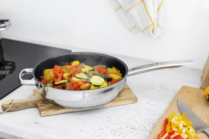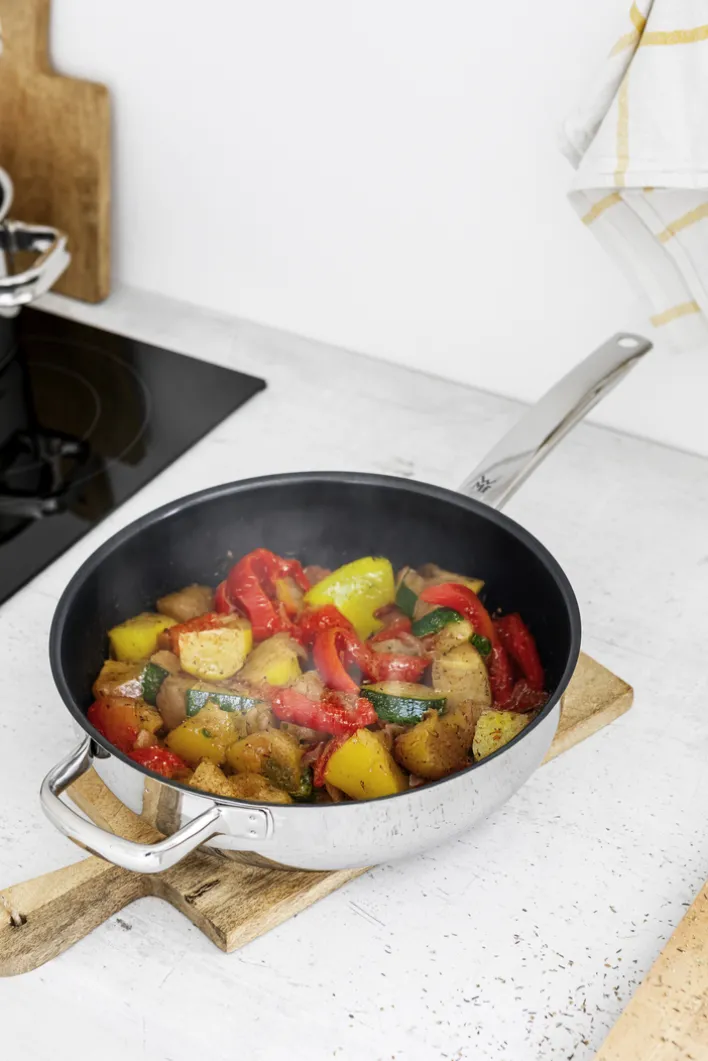Diese Schmorpfanne aus der Serie DURADO der Marke WMF hat einen Durchmesser von 28 cm und ist überwiegend silberfarben mit einem schwarzen Innenbereich. Die Pfanne besteht aus rostfreiem Edelstahl und besitzt eine Antihaft-Beschichtung, die das Anhaften von Speisen reduziert und die Reinigung erleichtert. Mit einem Gewicht von 1,6 kg bietet sie eine stabile Handhabung. Die Oberfläche außen ist hochglänzend poliert, während die Innenseite eine matte, glatte Struktur aufweist. Die Schmorpfanne ist backofengeeignet und sowohl für den täglichen Gebrauch in der Küche als auch für spezielle Zubereitungen geeignet. Das Design umfasst einen langen, ergonomischen Edelstahlgriff sowie einen zusätzlichen Gegengriff, was das sichere Heben und Tragen unterstützt.