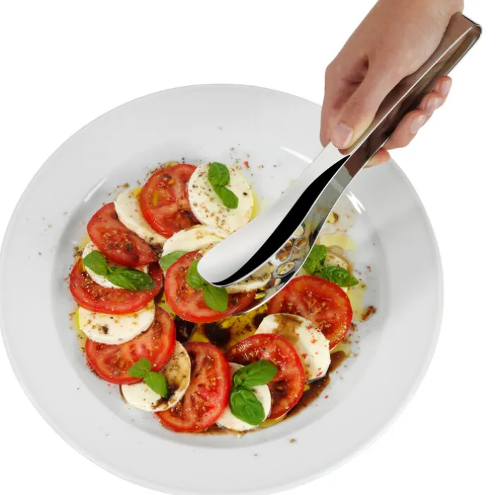 Mit der Servierzange NUOVA lässt sich Gästen auf ansprechende Weise auftischen. Mithilfe des Spezialbestecks können Salate, Nudeln oder Fleisch mit Leichtigkeit auf den Teller gehoben werden. Die miteinander verbundenen Griffe sind federnd, was zu einem optimalen Handling führt. Überschhüssiges Wasser, Fett oder Marinade kann durch die Löcher in der unteren Laffe abtropfen, sodass diese Flüssigkeiten nicht mitserviert werden müssen.