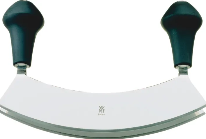 Das Wiegemesser hat handliche und ergonomisch wertvolle Griffe auf beiden Seiten, um die Kraft perfekt auf das Wiegemesser übertragen zu können. Die sehr scharfe Klinge des Wiegemessers ist aus speziellem, langlebigem Klingenstahl gefertigt. Das Wiegemesser eignet sich bestens zum filigranen Zerkleinern von Kräutern oder anderen Gewürzen. WMF bietet neben dem normalen Wiegemesser, auch Einhand-Wiegemesser oder Wiegemesser mit zwei Klingen an um die Zutaten noch schneller verarbeiten zu können.