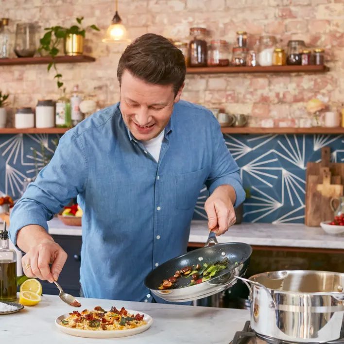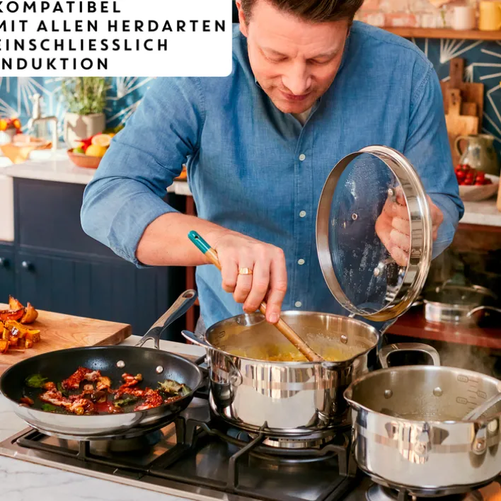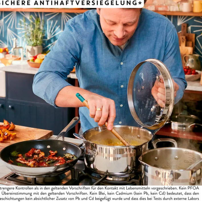 Dieser Wok aus der Serie JO COOK SMART überzeugt durch seine runde Form und eine hochwertige Verarbeitung aus Edelstahl. Die Außenfläche zeigt eine silberfarbene Oberfläche mit poliertem Finish, während das Innere mit einer schwarzen, antihaftbeschichteten Fläche ausgestattet ist. Der lange, ergonomisch gestaltete Griff besteht ebenfalls aus silberfarbenem Metall und ist stabil verschraubt. Im Inneren des Woks befindet sich ein markanter roter Punkt in der Mitte, der als Temperaturanzeige dient und ein punktförmiges Muster umgibt. Die Wandungen sind gleichmäßig hochgezogen, was das Schwenken und Vermengen erleichtert.