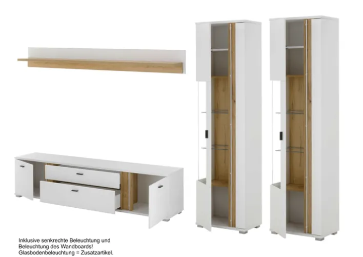 Diese Wohnwand ist eine ideale Wahl für alle, die Funktionalität und Ästhetik in ihrem Wohnraum vereinen möchten. Sie bietet nicht nur ausreichend Stauraum, sondern auch eine ansprechende Optik, die sich nahtlos in verschiedene Einrichtungsstile einfügt.