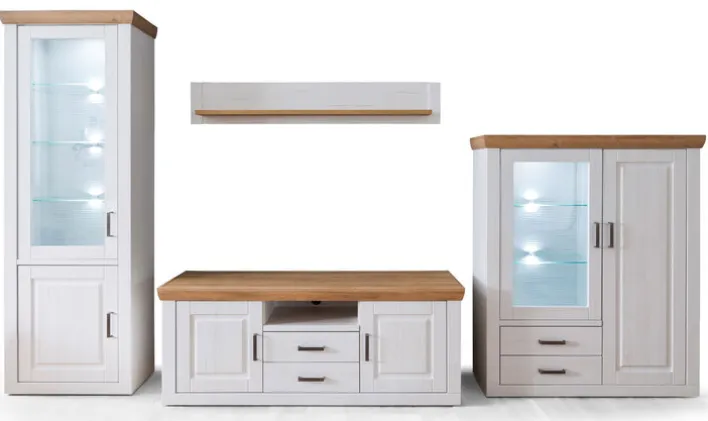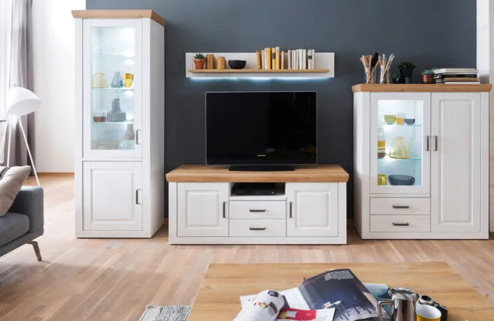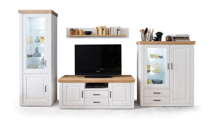 Die Wohnwand bietet hervorragende Möglichkeiten, um auf einer relativ geringen Stellfläche viel Stauraum zu realisieren. Die Wohnwand setzt sich aus einem TV-Möbel, zwei Vitrinen und einem Wandpaneel zusammen. Die verschiedenen Elemente bestehen aus einer hochwertigen Holznachbildung. Zudem sind die Vitrinen mit Glaseinsetzen ausgestattet. Da die Fronten und der Korpus in Weiß gehalten sind, kommen die Abdeckplatten der Möbel mit ihrem dekorativen Holzdekor besonders gut zur Geltung. Die Griffe aus schwarz gefärbtem Metall runden das Design gekonnt ab. Vor allem in idyllische und sehr gemütliche Einrichtungen lässt sich diese Wohnwand gut integrieren.