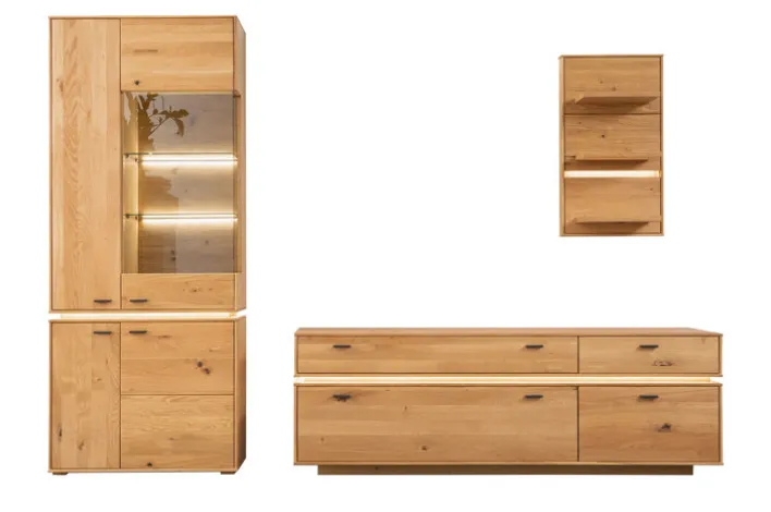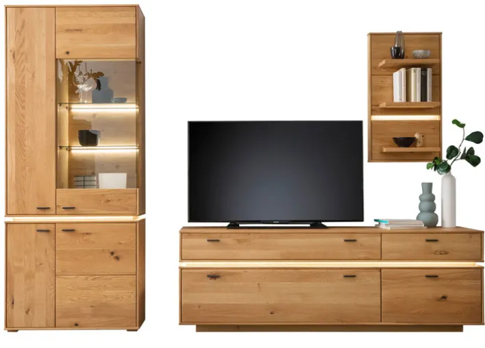 Diese Schrankwand besteht aus einem TV-Lowboard, einer Vitrine sowie einem Wandregal. Sie hat eine Tiefe von 51 cm, eine Breite von 286 cm und eine Höhe von 181 cm. Sie bietet viel Stauraum, so dass sie die Ordnung im Wohnzimmer unterstützt. Des Weiteren punktet sie damit, dass sie über eine wechselbare Beleuchtung am Korpus verfügt, wodurch sie abends ganz besonders gut in Szene gesetzt werden kann. Beim Holz handelt es sich um furnierte teilmassive Eiche, deren Oberflächenbeschichtung geölt ist.