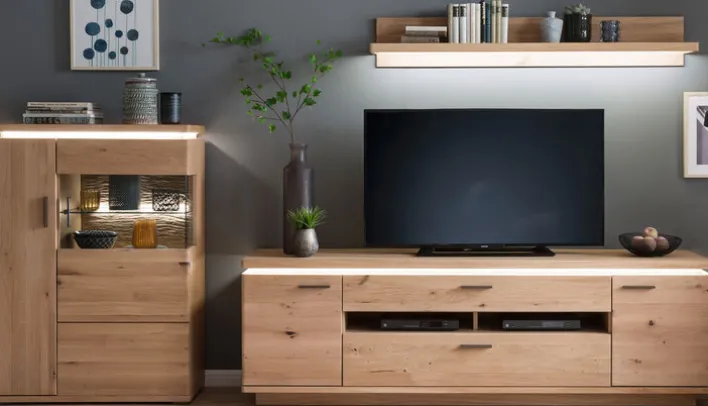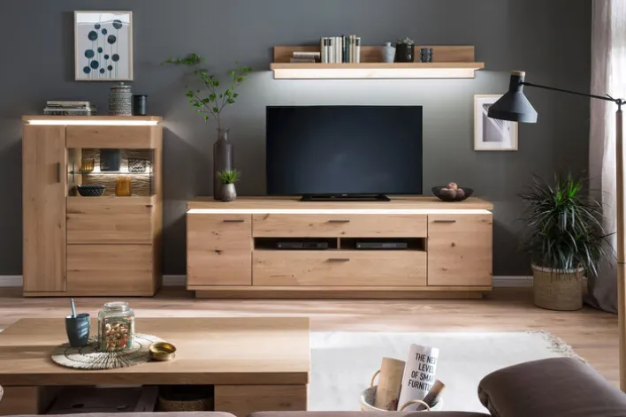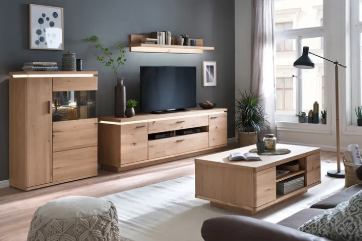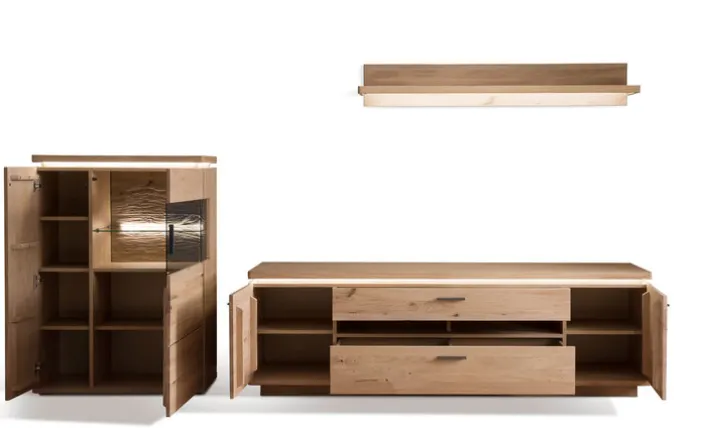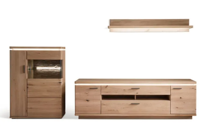 Die 3-teilige Wohnwand III BARCELONA vereint geradlinige Formen mit der natürlichen Holzmaserung von Balkeneiche bianco und schafft ein modernes Ambiente.