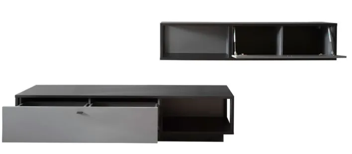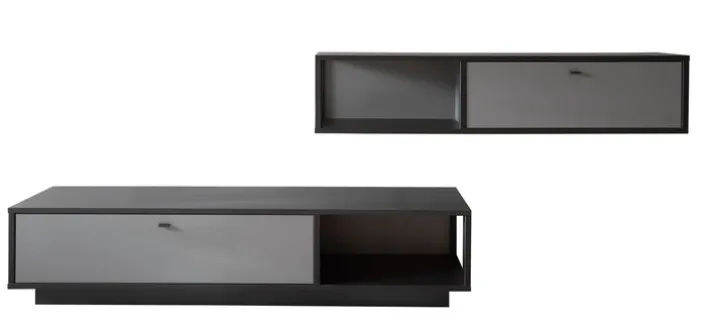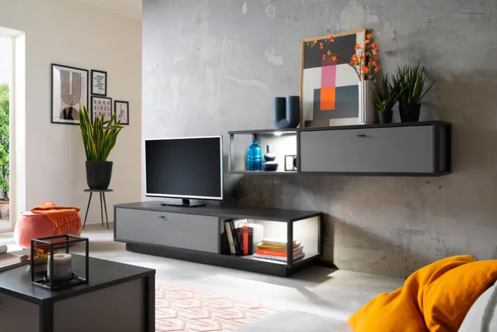 Die 2-teilige Wohnwand LUXOR überzeugt mit einem reduzierten Design und passt in das modern eingerichtete Wohnzimmer. Durch die eleganten Oberflächen in den Dekoren Royal Grau und Anthrazit sind das TV-Lowboard und der Hängeschrank vielseitig kombinierbar. Die Möbel sind mit offenen Fächern, Schubkästen und einer Klappe ausgestattet, die zusätzlichen Stauraum bieten. Für ein großes TV-Gerät ist ausreichend Platz vorhanden. Die Wohnwand rundet jede Einrichtung ab und sorgt für ein gemütliches Ambiente.