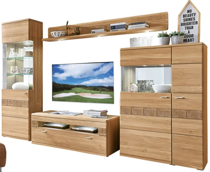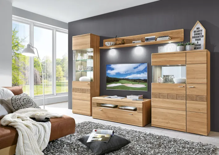 Massive Eiche trifft bei der Wohnwand auf hochwertige Holznachbildung mit naturgetreuem Eiche Dekor. Das Set gefällt mit gradlinigem Design, freundlicher Farbgebung und einem großen Angebot an verschieden verwendbarem Stauraum. Seine Ausstrahlung setzt in jedem Ambiente einen natürlichen Akzent.