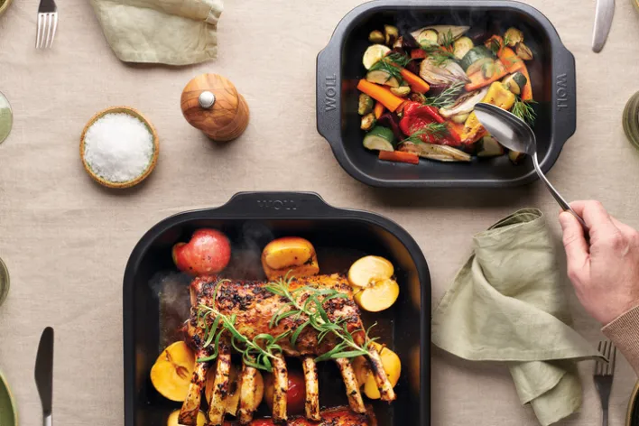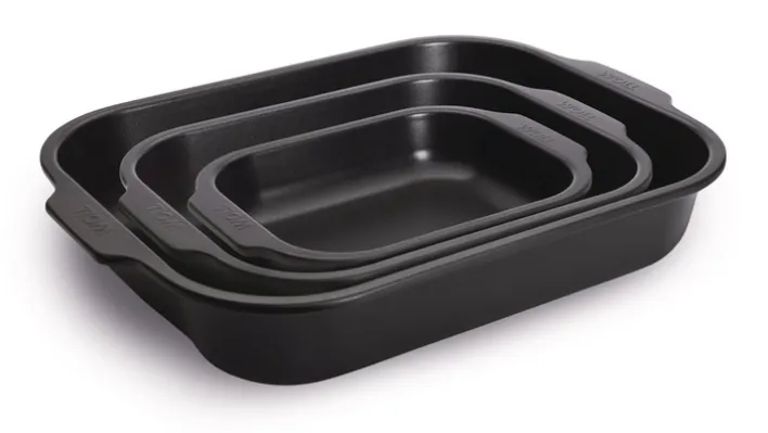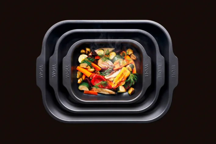 Das 3-teilige WOLL Auflauf-/Backform-Set ROAST IT! ist aus aluminisiertem Stahl gefertigt und besitzt eine verstärkte, zweilagige Antihaft-Versiegelung.