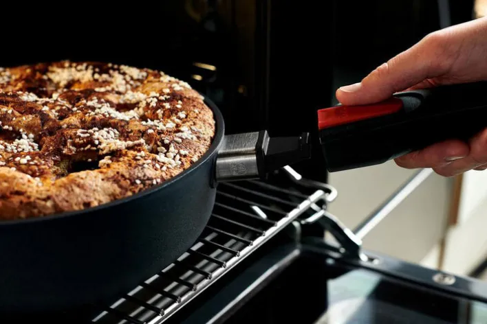 Die WOLL Gusspfanne DIAMOND LITE besteht aus handgegossenem Aluminium und hat ein Fassungsvermögen von 4,75 Liter. Durch die ultraharte Diamantversiegelung ermöglicht die Pfanne ein fast fettfreies Kochen. Darüber hinaus ist die Versiegelung schnittfest und sehr pflegeleicht. Die Reinigung in der Spülmaschine ist somit kein Problem. Punkten kann die Gusspfanne zudem mit ihrer Energieeffizienz, denn sie heißt sich sehr rasch auf. Das Highlight ist jedoch der abnehmbare Griff. Ohne Griff ist die Pfanne als Ofenform verwendbar und bis zu 250 °C backofenfest.