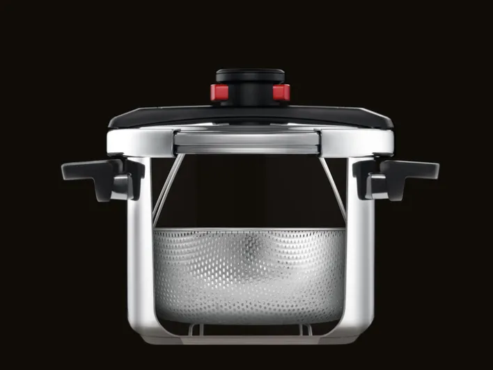 Der Deckel des Schnellkochtopfs verfügt im Deckel über die typischen Knöpfe und Bedienelemente. Ein Dünsteinsatz gehört zum Lieferumfang des Modells, das unter Garantie zu 100 Prozent German Engineered ist, dazu. Auf allen Herdarten sorgt der Topf aus Edelstahl und Kunststoff pünktlich für eine leckere Mahlzeit. Der Kochtopf wiegt mit Deckel nur 3,69 Kilogramm.