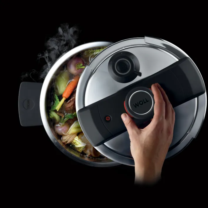 Der silberfarbige Schnellkochtopf PRESSURE PRO von WOLL bietet mit einem Volumen von 6 Litern viel Platz für Eintöpfe und Suppen sowie Currys. Das Modell misst insgesamt 34 Zentimeter Breite, 27,8 Zentimeter Tiefe und 24,6 Zentimeter Höhe. Im Inneren stehen 22 Zentimeter Durchmesser zur Verfügung.