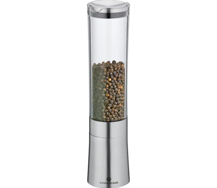 Mit ihrer silberfarbigen Edelstahloptik fügt sich die elegant gestaltete ZASSENHAUS Pfeffermühle KOBLENZ edel in den dekorativen Charme einer festlich gedeckten Tafel ein.