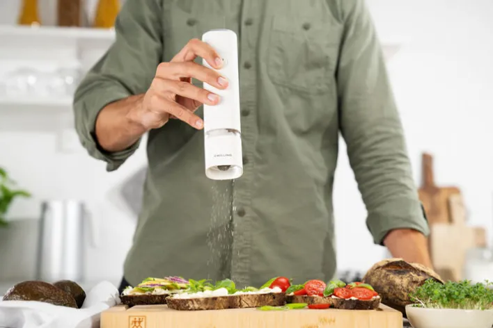 Die elektrische Salz- & Pfeffermühle ENFINIGY von ZWILLING in der Farbe Weiß ist ideal bei Tisch oder in der modernen Küche. Entworfen von den Mailänder Designern Matteo Thun und Antonio Rodriguez, macht die akkubetriebene Mühle eine gute Figur. Die zylindrische Gewürzmühle mahlt Salz, Pfeffer oder Gewürze auf Knopfdruck. Das hochwertige Keramikmahlwerk ist nahezu verschleißfrei. Der leistungsstarke Motor der Salz- & Pfeffermühle mahlt ganz nach individueller Einstellung grob oder fein.