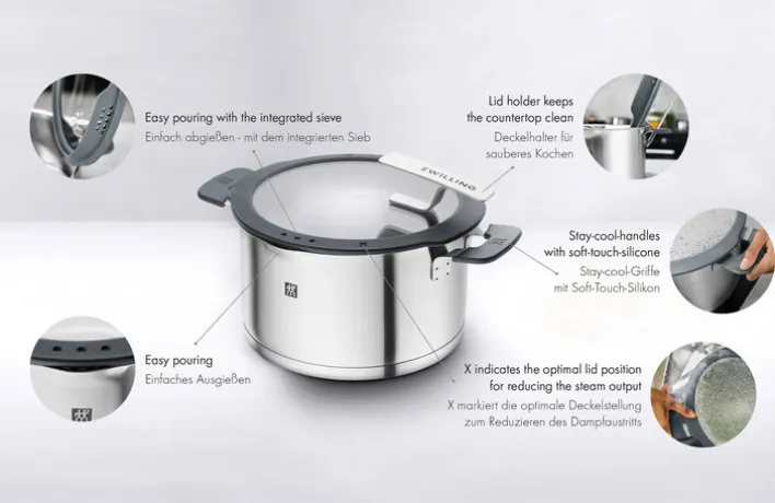 Die Töpfe verfügen über einen Sandwichboden und sind mit Stay-cool-Griffen ausgestattet. Eine innenliegende Skale hilft beim Abmessen von Flüssigkeiten für Suppen und Soßen. Ein im Deckel integriertes Sieb erleichtert das Abgießen von Nudelwasser. Die Kochtöpfe SIMPLIFY können auf allen Herdarten eingesetzt werden und lassen sich bis 180° im Backofen verwenden.