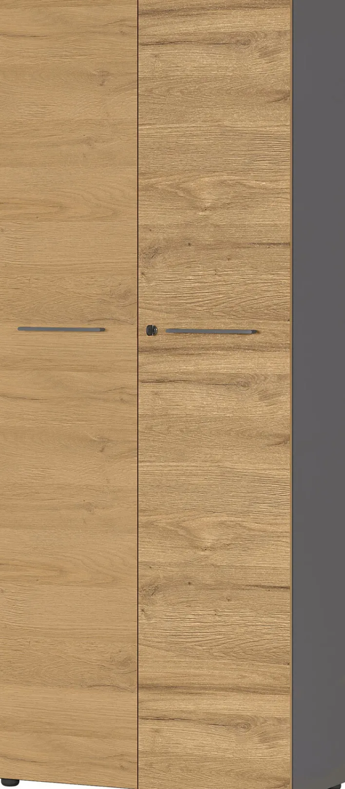 Harmonisch verbinden sich der graphitgraue Korpus und die Türfronten in Grandson-Eiche Optik des Aktenschranks ISORNO zu einer Einheit. Abgerundet wird das Design durch graphitfarbige Bügelgriffe aus Metall und schwarze Möbelgleiter. Die ansprechende Holznachbildung verleiht dem Möbel einen natürlichen Charakter. Mit einer Höhe von 197 cm bietet dieser Schrank in insgesamt fünf Fächer Platz für Akten, Arbeitsutensilien, Bücher und Ordner.